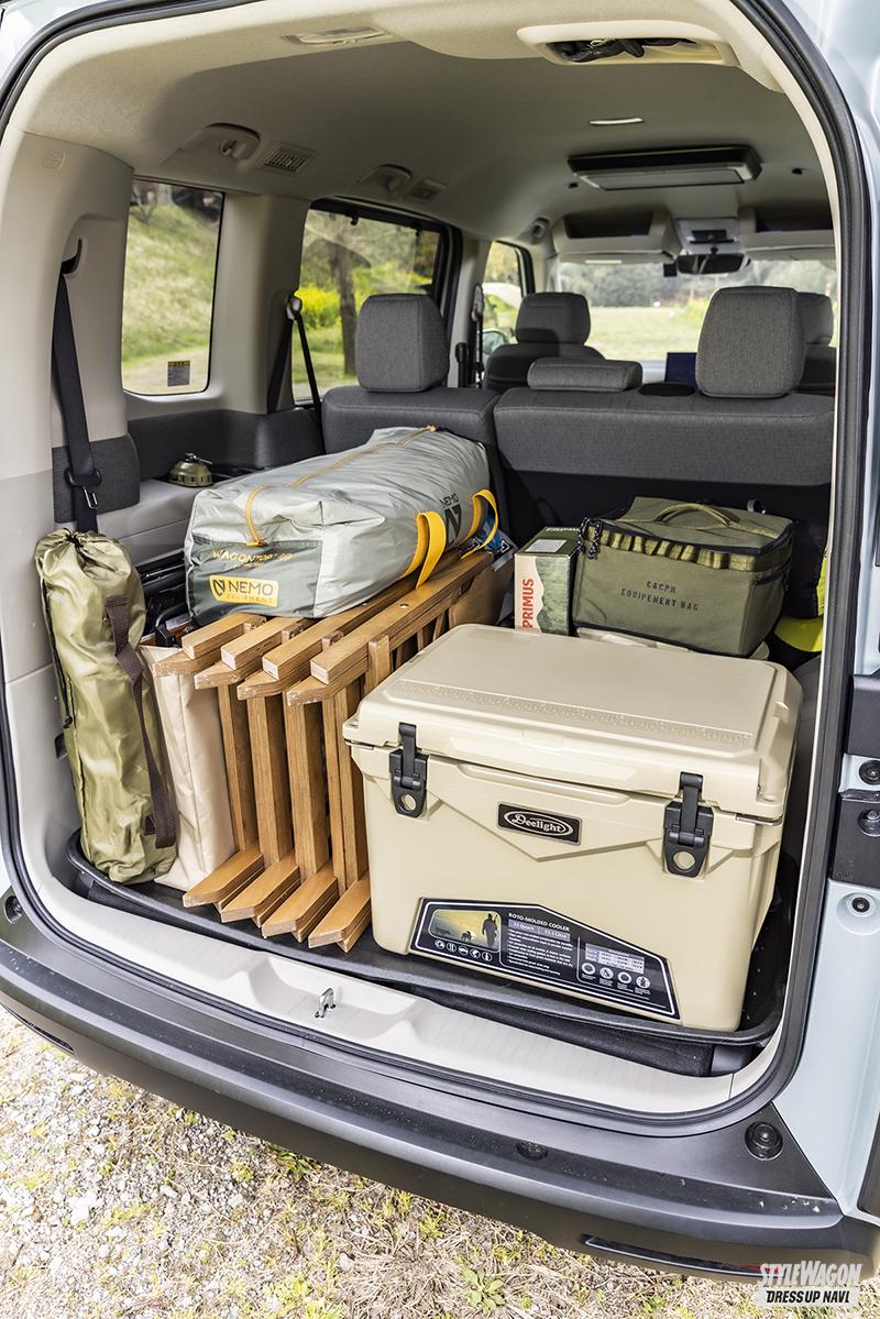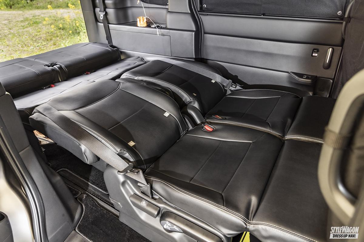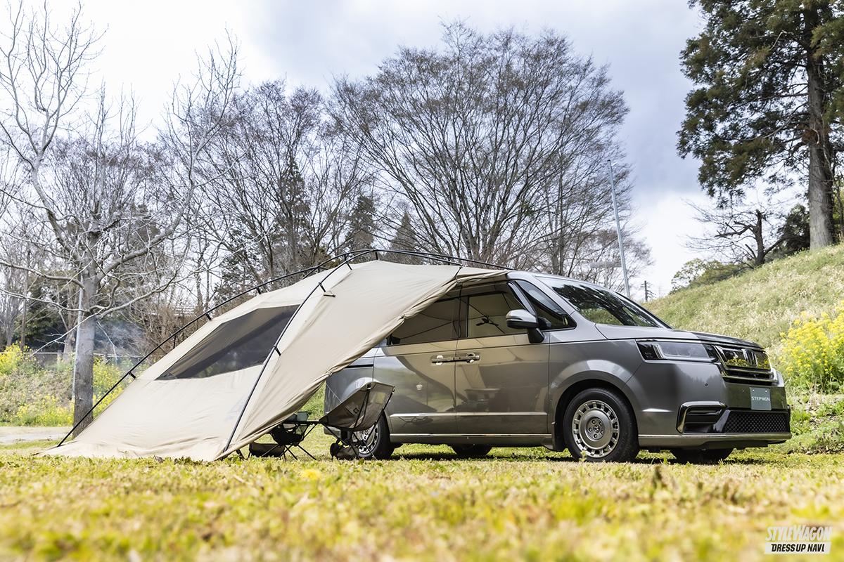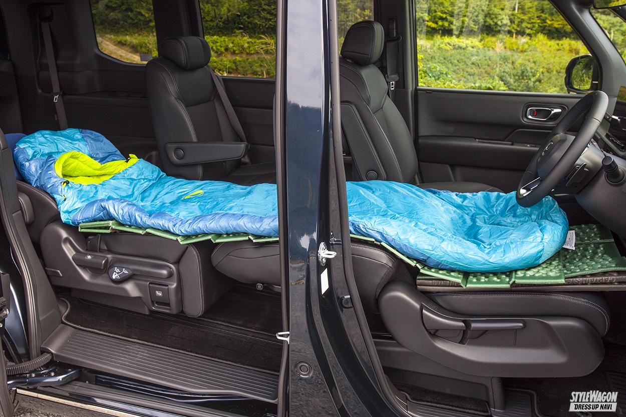 スパーダは、テントを使わず、車中泊をベースとしたキャンプスタイルを提案。ステップワゴンは2、3列目をフラットにすれば就寝スペースとして十分な広さを確保できる。シートの座面・背面に段差ができるが、エアマットやクッションなどで段差を埋めていけば快適に寝ることも可能だ。テントを使わないため設営はコンパクト。オガワのカーサイドリビングで大人2人がくつろぐには十分なスペースを作り、お手軽キャンプ。