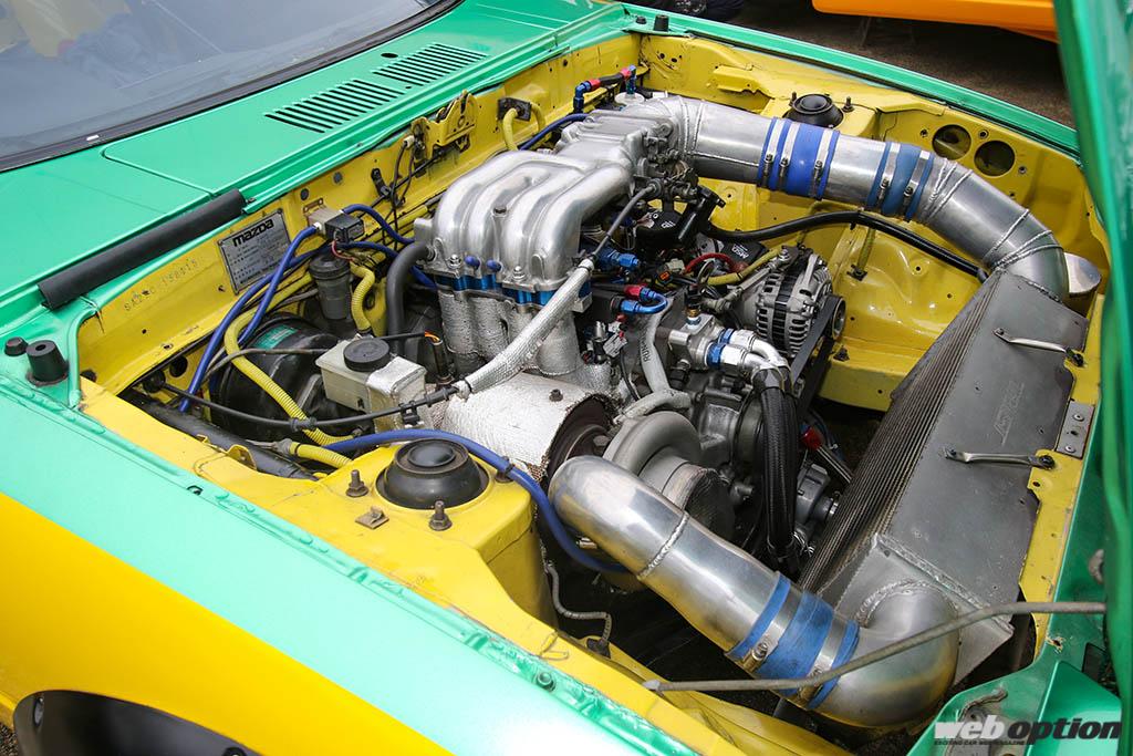 エンジンは13Bをベースに製作されており、ポート形状はサイドポートにペリフェラルポートを組み合わせたクロスポート仕様となる。タービンは国内最大級のT88-34Dをセット。最高出力は未計測だが、最大ブースト圧は1.7キロの設定で1万rpmまで回すそう。エンジンマネージメントはLINKのフルコンによるものだ。