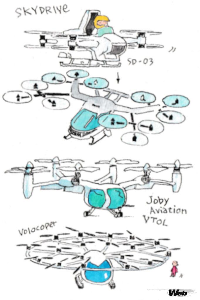なお、トヨタ自動車はカワサキや全日空(ANA)とともにジョビーに投資しているほか、エンジニアリング面では、国内最大手のレーシングカー・コンストラクターである童夢から派生した東レ・カーボンコンポジットがスカイドライブなど複数のスタートアップ企業に技術支援を行っている。