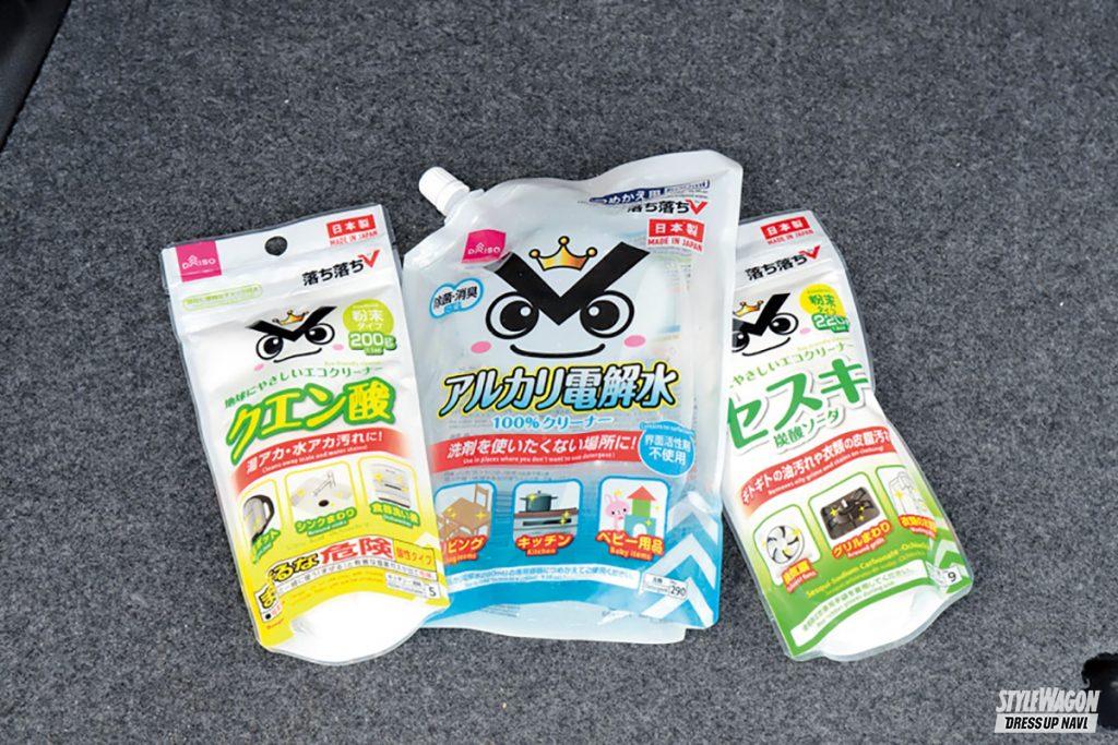 奥様たちに愛用される100均だけに、素材に優しく、効果絶大なクリーナーたちがとても充実している。一部で話題になってヒットしたセスキ水やアルカリ電解水なども100円で購入が可能。
