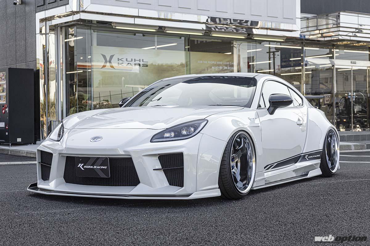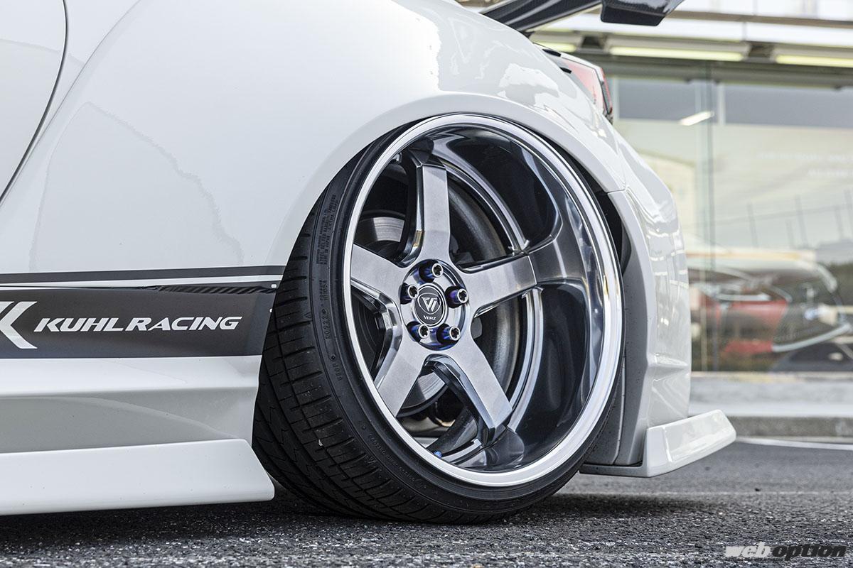 撮影車両はフロント60mm、リヤ70mmワイドの03R-GTWエアロを纏ったGR86にフルリバースのDDR01(F10.5Jマイナス17×19インチ、リヤ11Jマイナス23×19インチ)をマッチング。フロント142mm、リヤ155mmものディープリムによって、これでもかと言わんばかりの深みを打ち出している