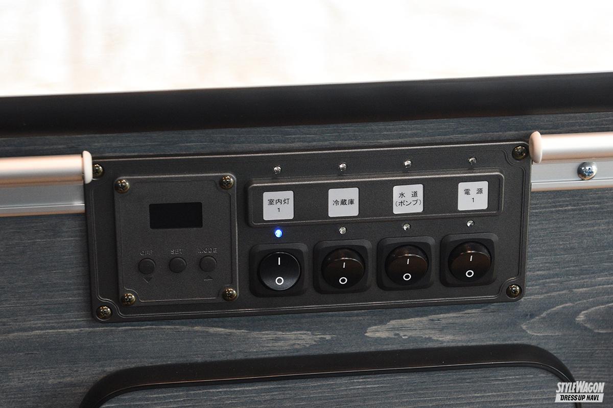 ■標準装備:室内装飾、床張り(クッションフロア)、リア常設ベッド、サイドカウンター収納庫、車内カーテン、サブバッテリー(105A)、AC100V基本配線、DC12V基本配線、走行充電システム、外部充電システム、冷蔵庫、コンダクトリレー、外部コンセント、コントロールパネル