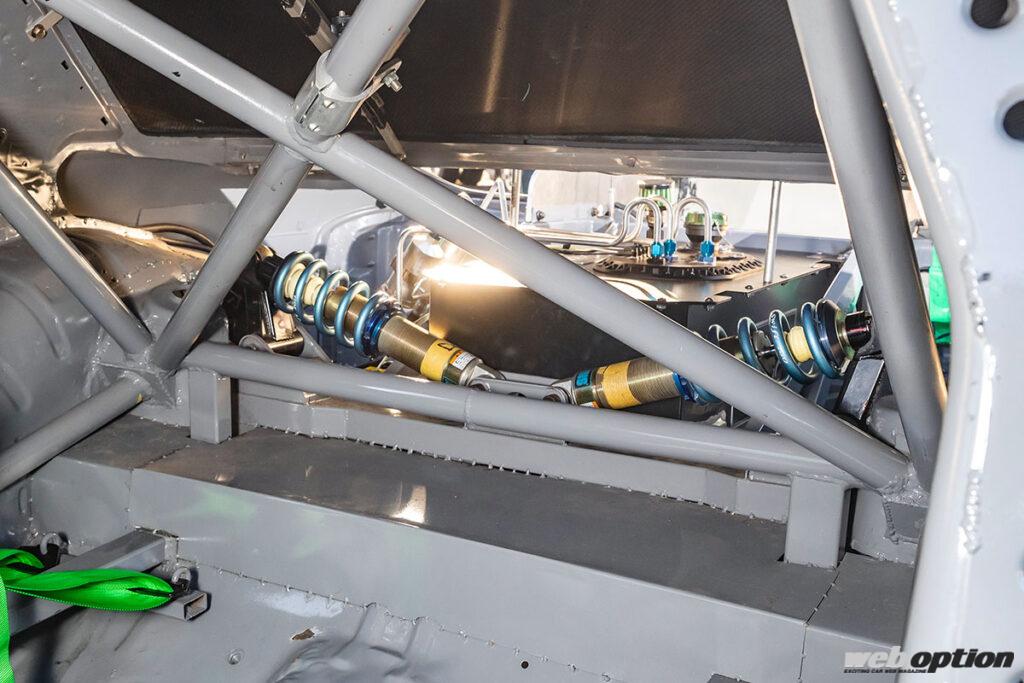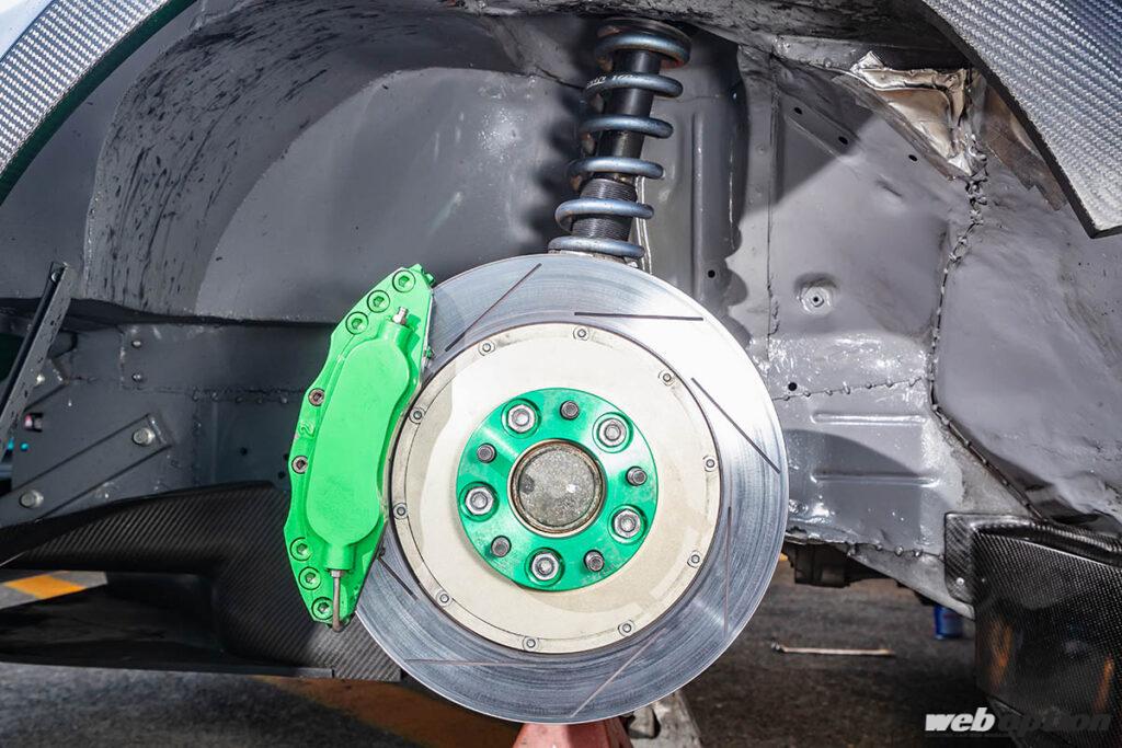 フロントのサスペンションはシルクロードの市販品だが、ピロアッパーの左右入れ替えやブラケットの加工、アーム類の延長加工によってトレッド幅を片側80mmほど拡幅。ブレーキはエンドレスのシステムを投入。