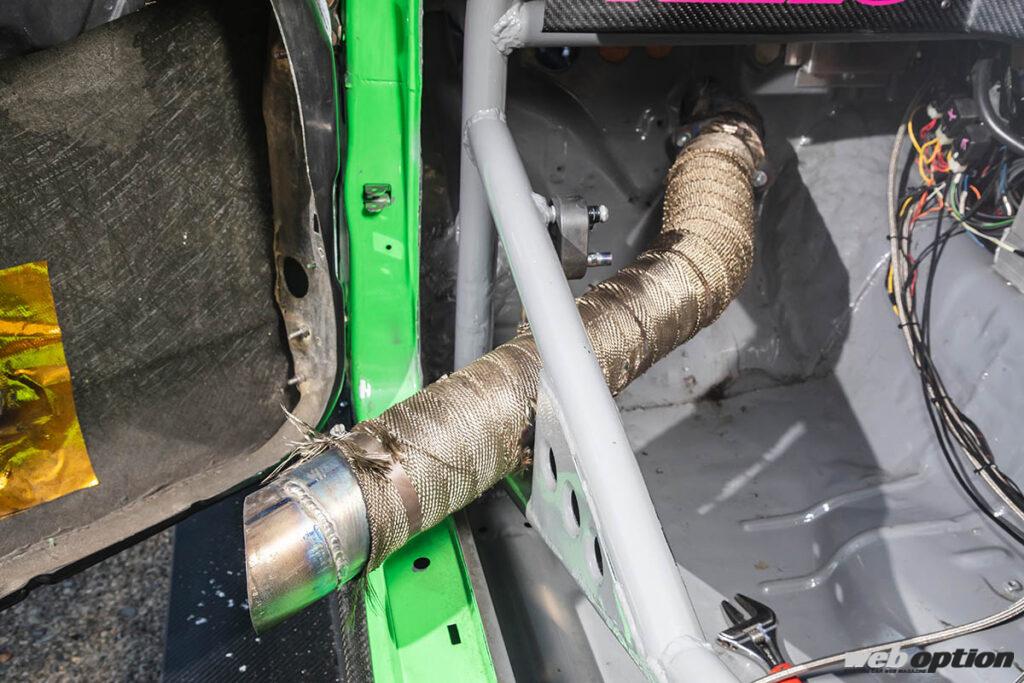 タービンはGCGのG35-1050タービンで、エンジンのマネージメントはLINK。燃料はアルコール系のE85を使用しつつ、各シリンダーにノズルを設けるシーケンシャルショット式のNOSも装備。未計測のため正確な数値こそ不明だが、1000psオーバーも十分に狙えるスペックだ。