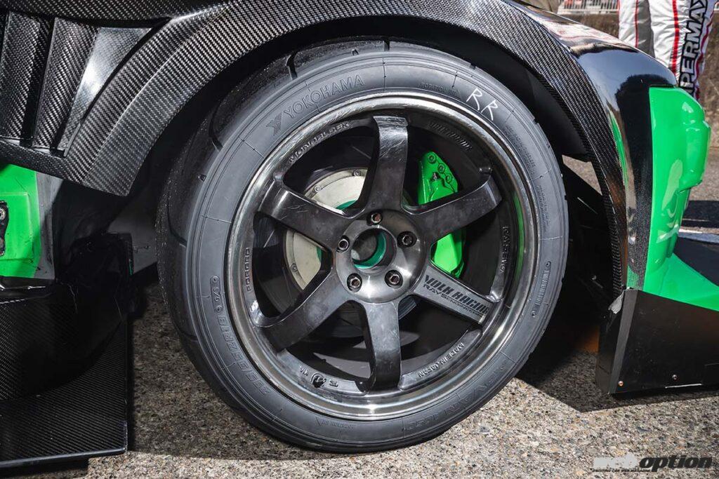 タイヤは前後ともにアドバンA050の295/35R18サイズをセット。ホイールはレイズボルクレーシングTE37(サイズ不明)このサイズを使い切るためのワイドボディは、2023年シーズンに投入されたドライカーボンによるワンオフスペシャルだ。