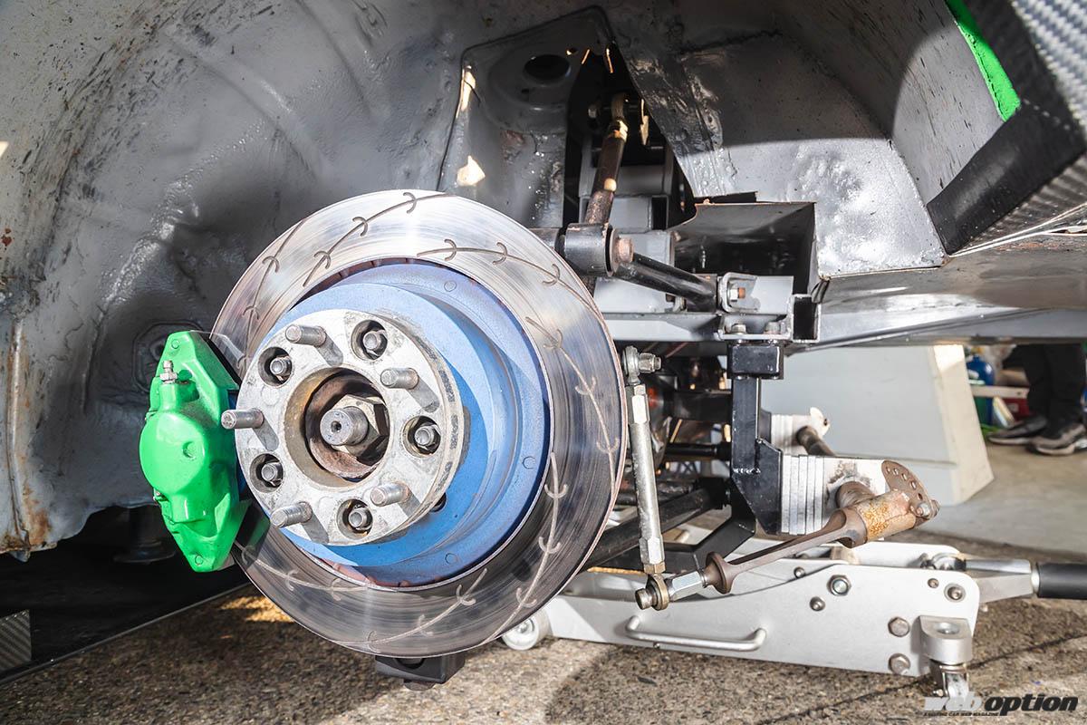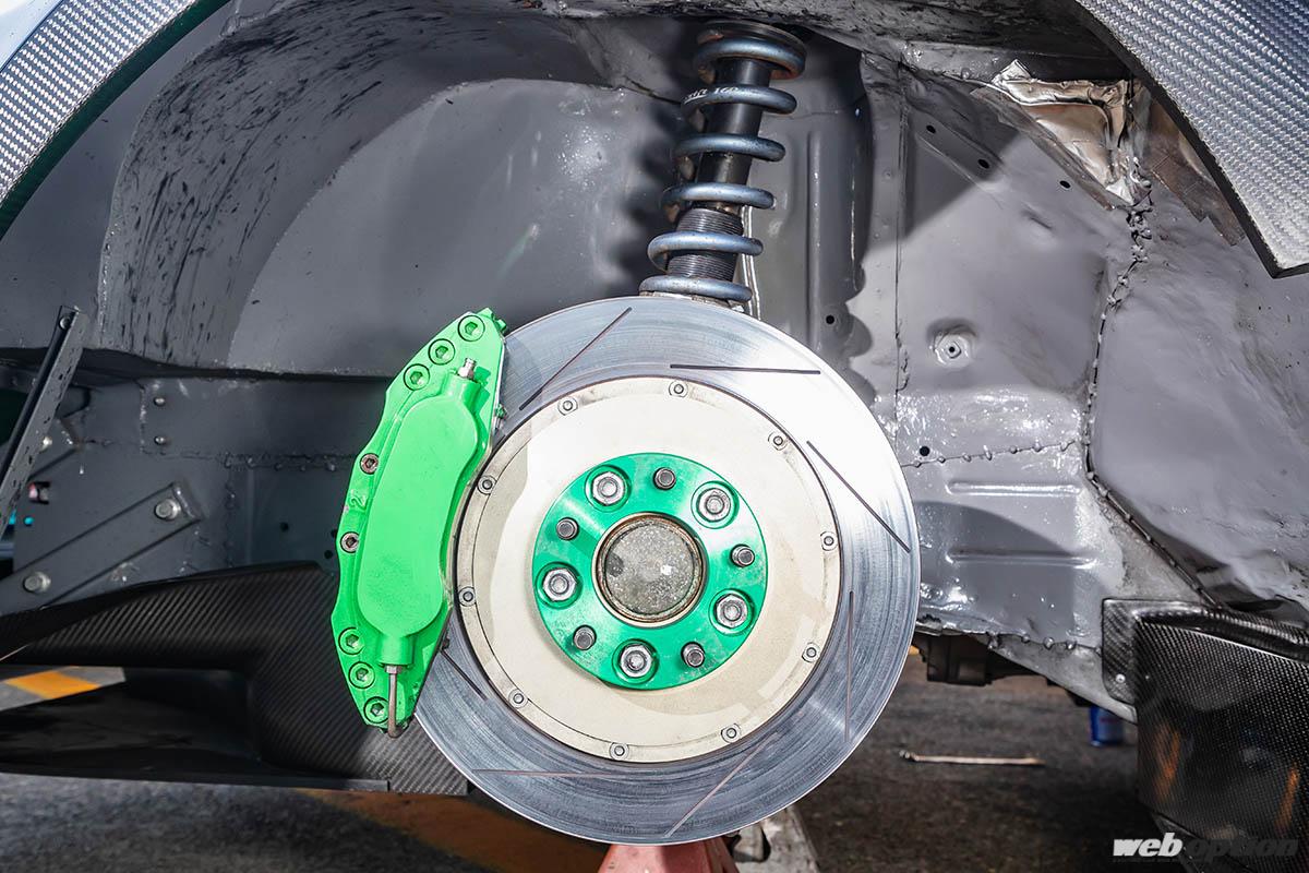 フロントのサスペンションはシルクロードの市販品だが、ピロアッパーの左右入れ替えやブラケットの加工、アーム類の延長加工によってトレッド幅を片側80mmほど拡幅。ブレーキはエンドレスのシステムを投入。