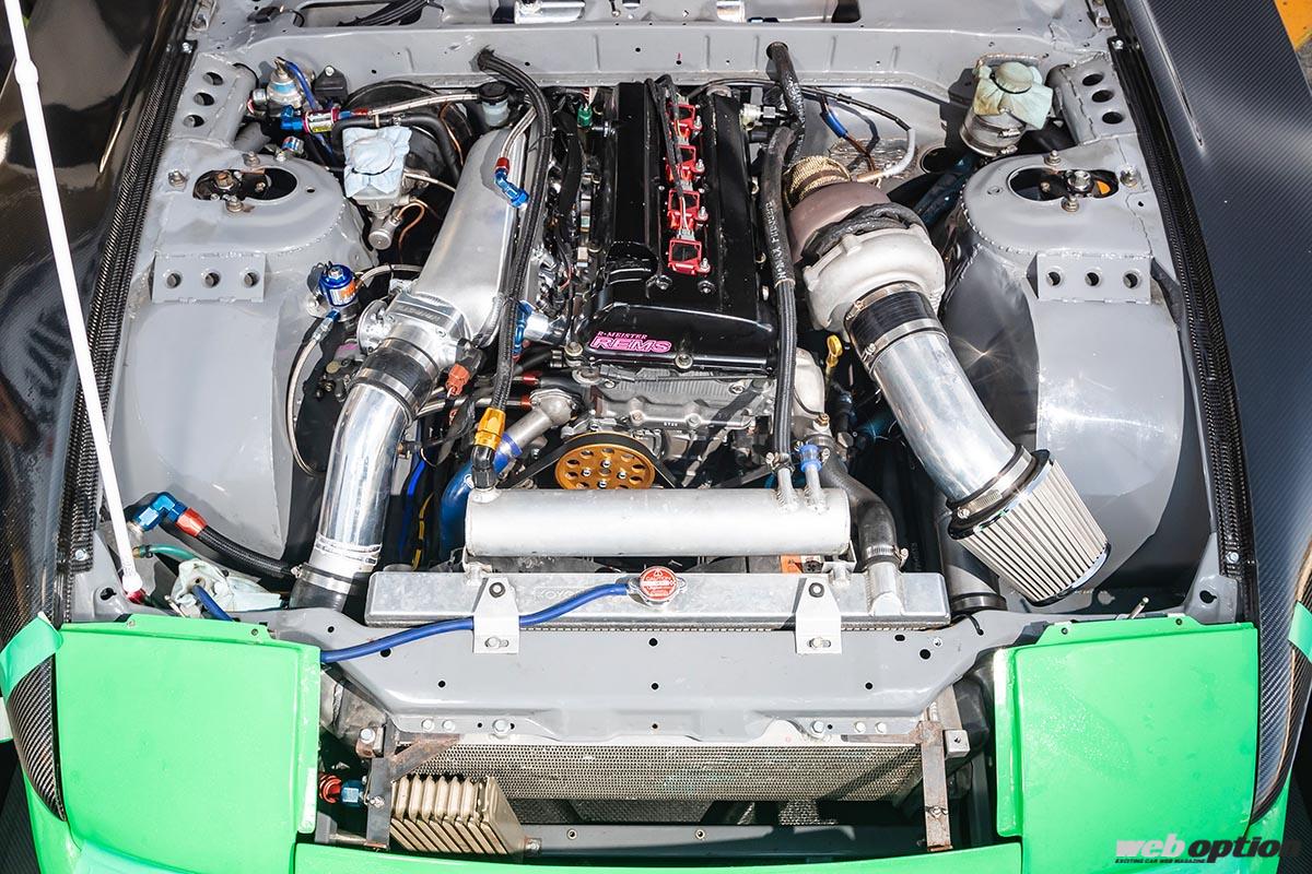 以前はHKSのキャパシティアップグレードキットを軸にしたSR20DET改2.2L仕様だったが、2023年シーズン前にエンジン本体をアップデート。排気量こそ2.2Lのままだが、ムービングパーツを海外製パーツで組み直し、ヘッドも可変バルタイ機構を持つVEヘッドとされた。