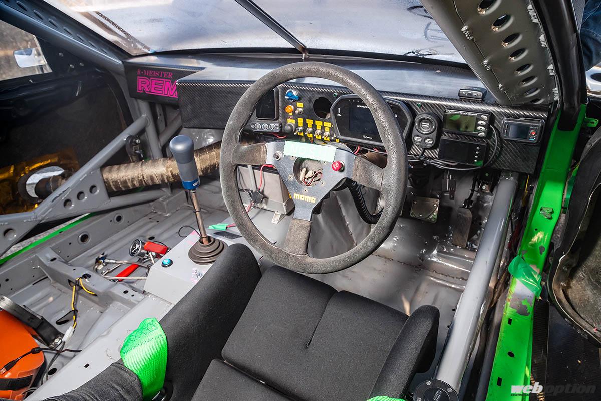 カーボンダッシュやアクリルウインドウなど、徹底的な軽量化が行われているインテリア。ロールケージはピラーと接合しつつフロントはストラットまで伸ばしてボディ剛性を引き上げている。ミッションはホリンジャーの6速シーケンシャルRD6-S。エキゾーストは室内を抜けて最短距離で排気されるスパルタン仕様だ。