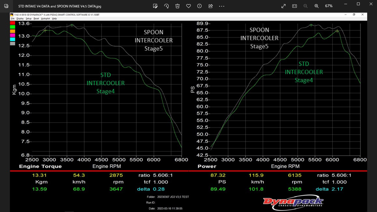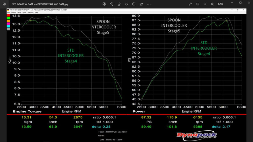 このキットの実力は凄まじく、ブーストアップ仕様(スプーンマフラー&エアクリ装備)では75.12ps&12.33kgmから76.38ps&12.72kgmへ、タービン交換仕様では87.32ps&13.31kgmから89.49ps&13.59kgmへと、それぞれ出力アップを果たしている。