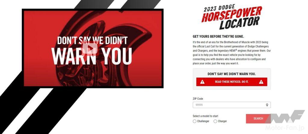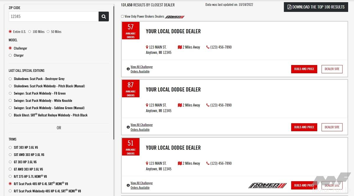 現行モデルで生産を終了するダッジ・チャレンジャーとダッジ・チャージャーの注文受付がアメリカで開始された。2023年型チャレンジャー/チャージャーは、エントリーモデルのSXTからSRTシェルブレイクまで、またATミッション車からMTミッション車まで、ほぼすべてがダッジディーラーに割り当てられている。同時に、DodgeGarage.comで利用できる「ダッジ・ホースパワー・ロケーター(DHL)」では、モデル、特別仕様車、トリムレベルによって、ダッジ販売店を簡単に検索することができる。