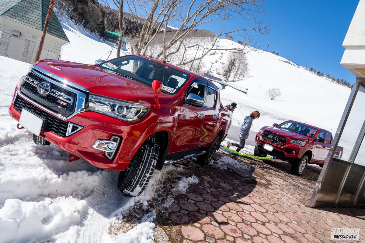 撮影当日はスキー場オーナーから特別許可を得たんだけど、さすがにゲレンデは雪深くて四駆のLOWモードでもスタック。2人で牽引ごっこする羽目に(涙)
