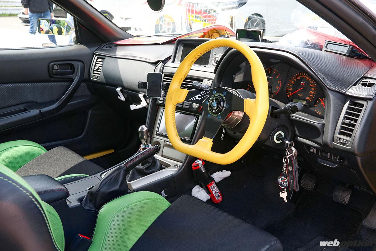 参加者それぞれ、レイズホイールに深い拘りを持っている人ばかりだったが、会場をチェックしてまわるWEB OPTION取材班のレーダーが反応したのがこのBNR34。名作Gr.CのDNAを受け継いで2021年に登場した、ボルクレーシング21Cのパンフレットにも使用されたチューンドだ。