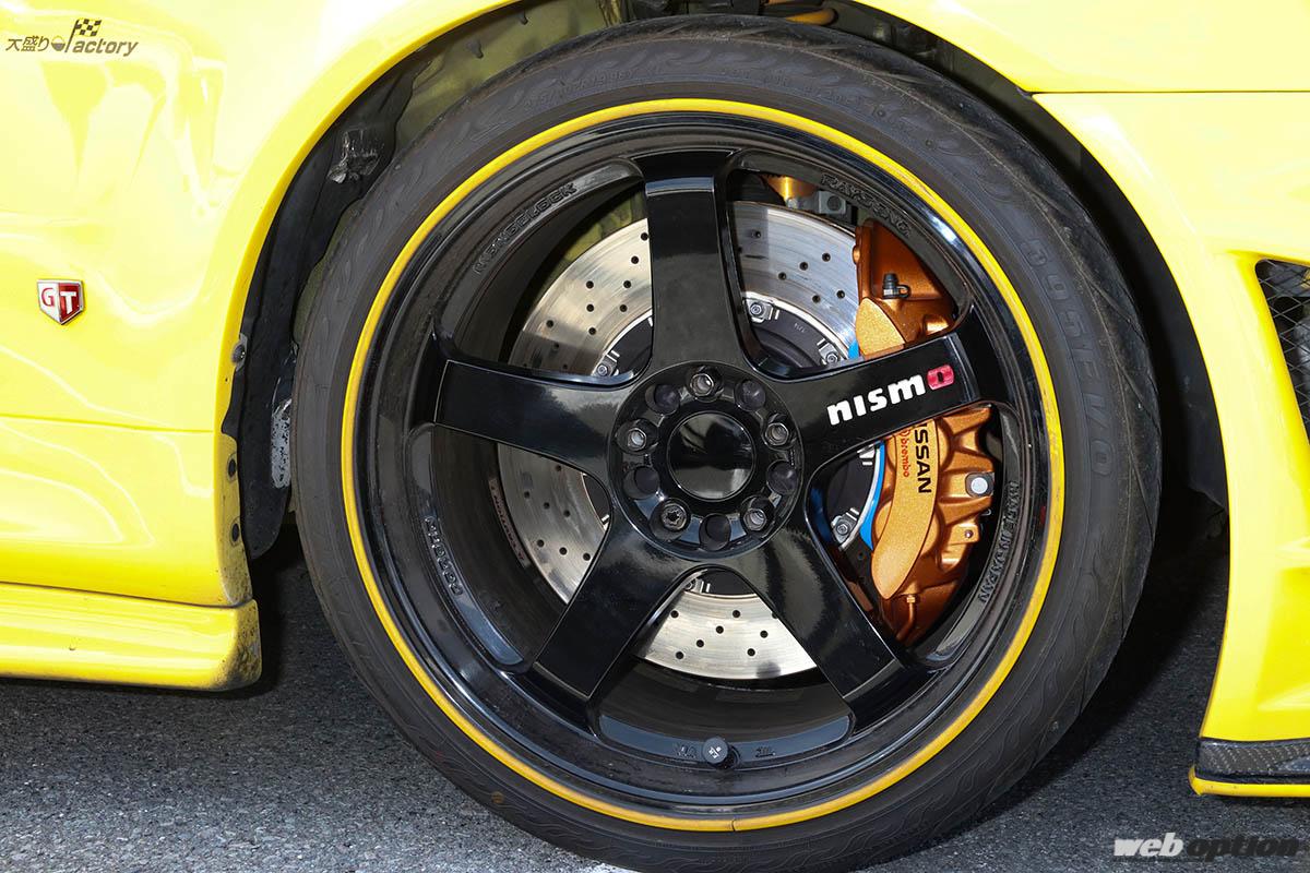 サスペンションはオリジナルのS-tune専用品から、ニスモファクトリーラインのオーリンズ製に変更。レイズ製のLMGT4ホイールは19インチ(10.5J+15)にサイズアップ(オリジナルは18インチ)し、R35GT-R用ブレンボキャリパーと大型ローターによりアップデートを図っている。