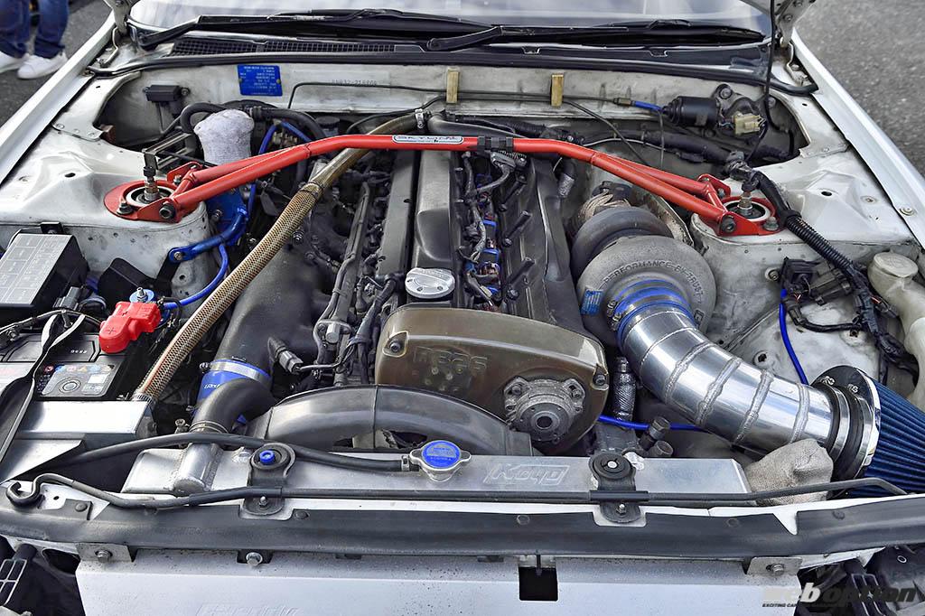 エンジンは排気量を2.6Lのままとしながらも、CPキャリロのピストンなどを組み込んで耐久性を向上。タービンはトラストのT78-29Dをセットして580psまで出力を高めている。制御は東名パワードのレイテックによるものだ。