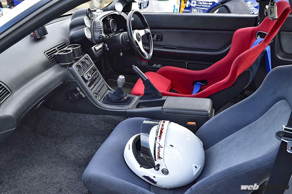 室内は快適装備満載。運転席がフルバケットシートに交換されているが、内装パネルやシートは純正をキープしている。車重は1500kg。ミッションは“ながおテクノ”の5速クロスを装備して加速力に磨きをかける。