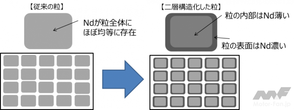 ネオジム磁石の構造を詳細に眺めていくと、主相結晶と粒界層に分けられる。保磁力を高めるためには粒界層を厚くして主相のそれぞれを磁気的に孤立させること、あるいは主相結晶を微細化することが有用だと発表されている。いっぽうで、保磁力を高めるために主相結晶にネオジムが一律に分布している必要はない。そこで外側の濃度を濃く内側を薄くすることで、全体としてのネオジム使用量を抑える構造とした。