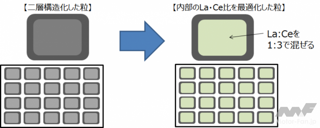 具体的には、ネオジムの代替として量に不安のないセリウムとランタンを用いて合金とし、これらを殻構造の内側でリッチ分布にすることで、全体としてネオジムの使用量を削減している。とはいえ、セリウムとランタンを混ぜることはこれまで技術的に困難だった。トヨタはさまざまな試行錯誤のうえ、セリウム3:ランタン1の割合でうまく混合できることを発見、Nd14Fe2Bの組成を(Nd+Ce+La)14Fe2Bとすることに成功している。セリウムとランタンも、一応レアアースの一種ではあるのだが、ネオジムを掘れば掘るほどセリウムとランタンが出てきて、鉱山では余剰資源として扱われているという性質のものであり、その意味からもこの試みは成功を収めていると言えるだろう。