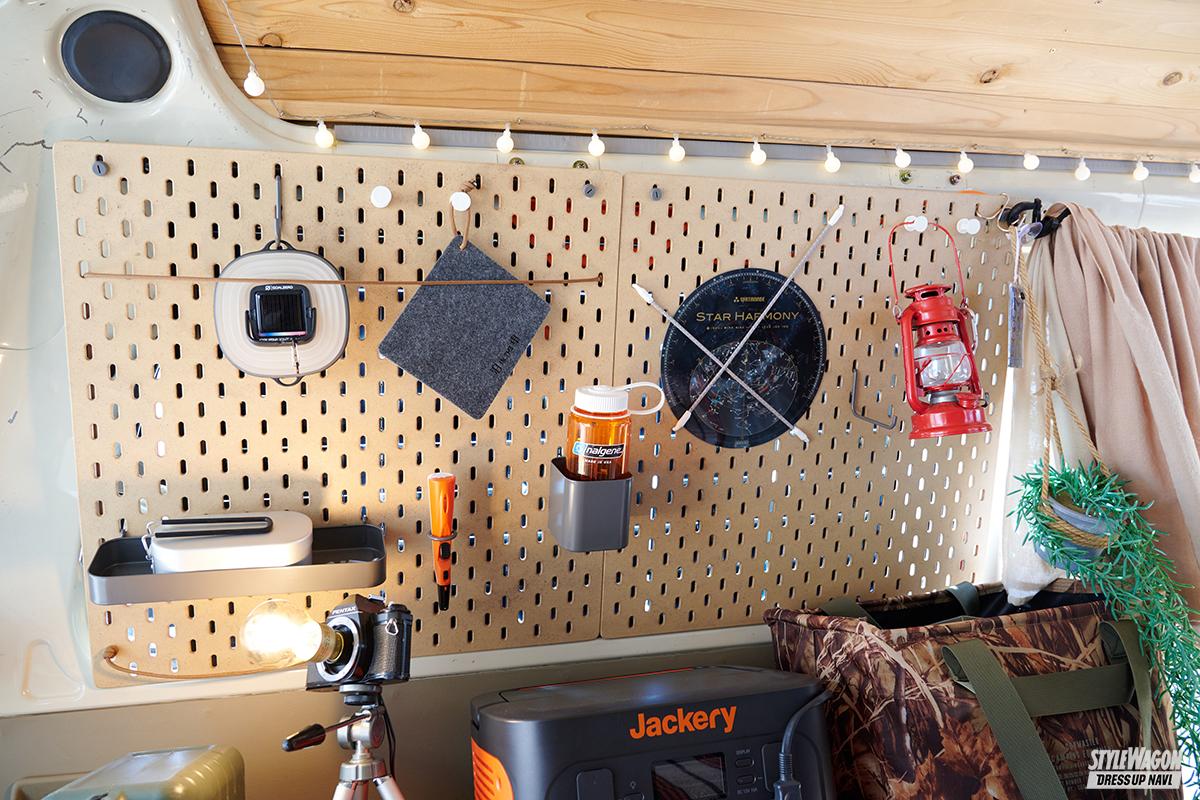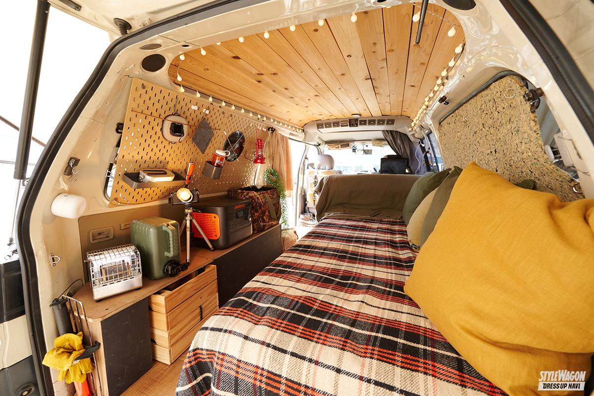 インテリアはラゲッジスペース全体を使ってベッドと棚をセット。床は土足で利用できるようになっていて、アウトドアキャンプの利用を想定した仕様。インテリアにも統一感があり、ウッディテイストが落ち着きのある空間を作り出した。