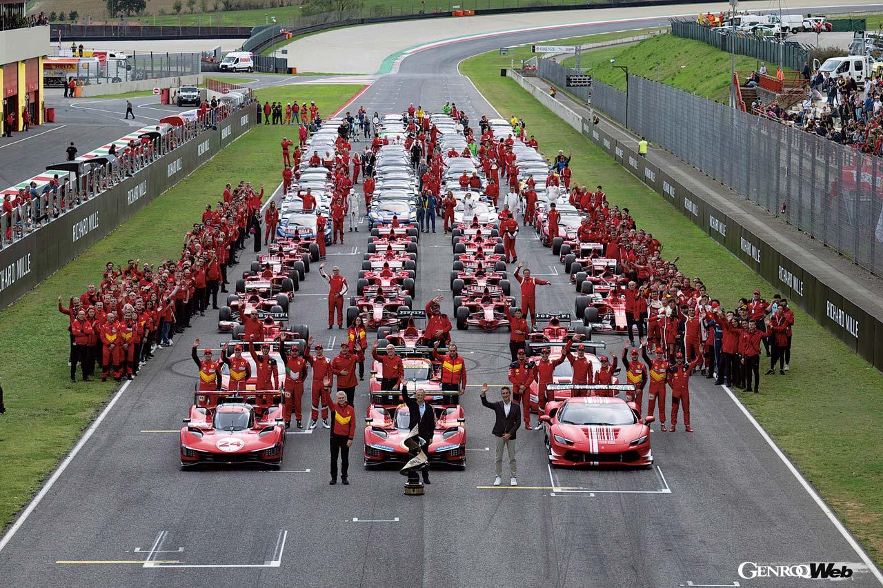 純粋にサーキット走行を楽しむオーナーのための専用マシン向けのXXプログラムには、FXXや599XX、FXX Evo Kといった歴代XXモデルが多数参加し、事前情報では過去最多の57台がエントリーしたという。もちろんレーシング・フェラーリの花形であるF1クリエンティも開催され、個人所有のF1マシンが19台も走行したという。あるいは過去30年間で登場したGTレーシングカーが参加できるクラブ・コンペティツィオーニGTも、このプログラムのために特別に製作された488GTモディフィカータを含めて39台の大量エントリーがあった。都合200台を超えるレーシング・フェラーリがムジェロに集結し、サーキットはまさに年に一度のお祭りに相応しい華やかさに包まれた。