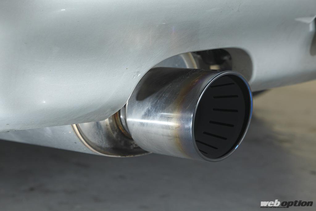 助手席側のヘッドライトを加工して通風孔を作り、フレッシュエアをタービンへとダイレクトに送り込む。これだけでも、凄みを感じさせる雰囲気を醸し出している。なお、エクステリアはトラストのフロントリップを装着したシンプルメイクだ。