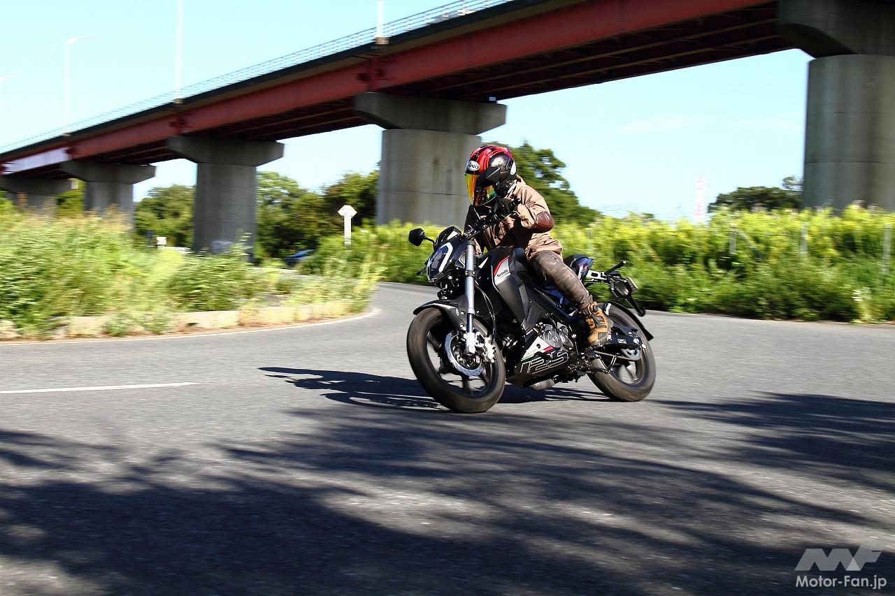 クラッチをつなぐと軽快な単気筒サウンドとともにスタート。125ccとしてはなかなか力強い印象を受ける。低回転域からしっかりとトルクが出るエンジン特性で、中回転域からの伸びも良い。信号などでのストップ&ゴーを繰り返すストリートで多用する回転域で扱いやすいフィーリングなので、軽量な車体をキビキビと元気に加速させることができる。