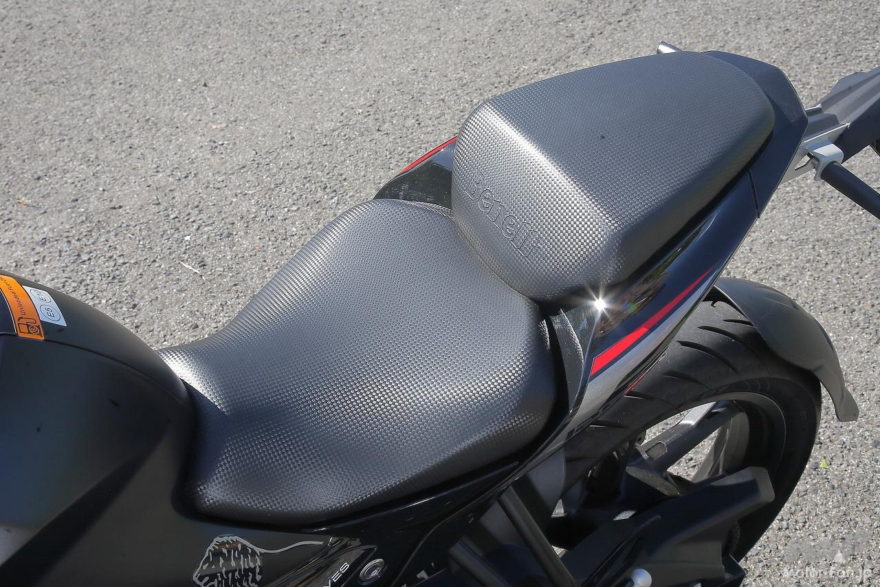 スポーツバイクらしく段差がある2ピースタイプのシートを採用。タンデムシートのスポンジも肉厚だ。