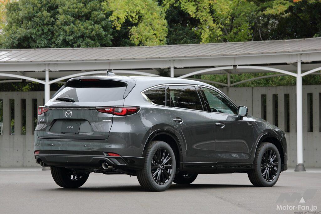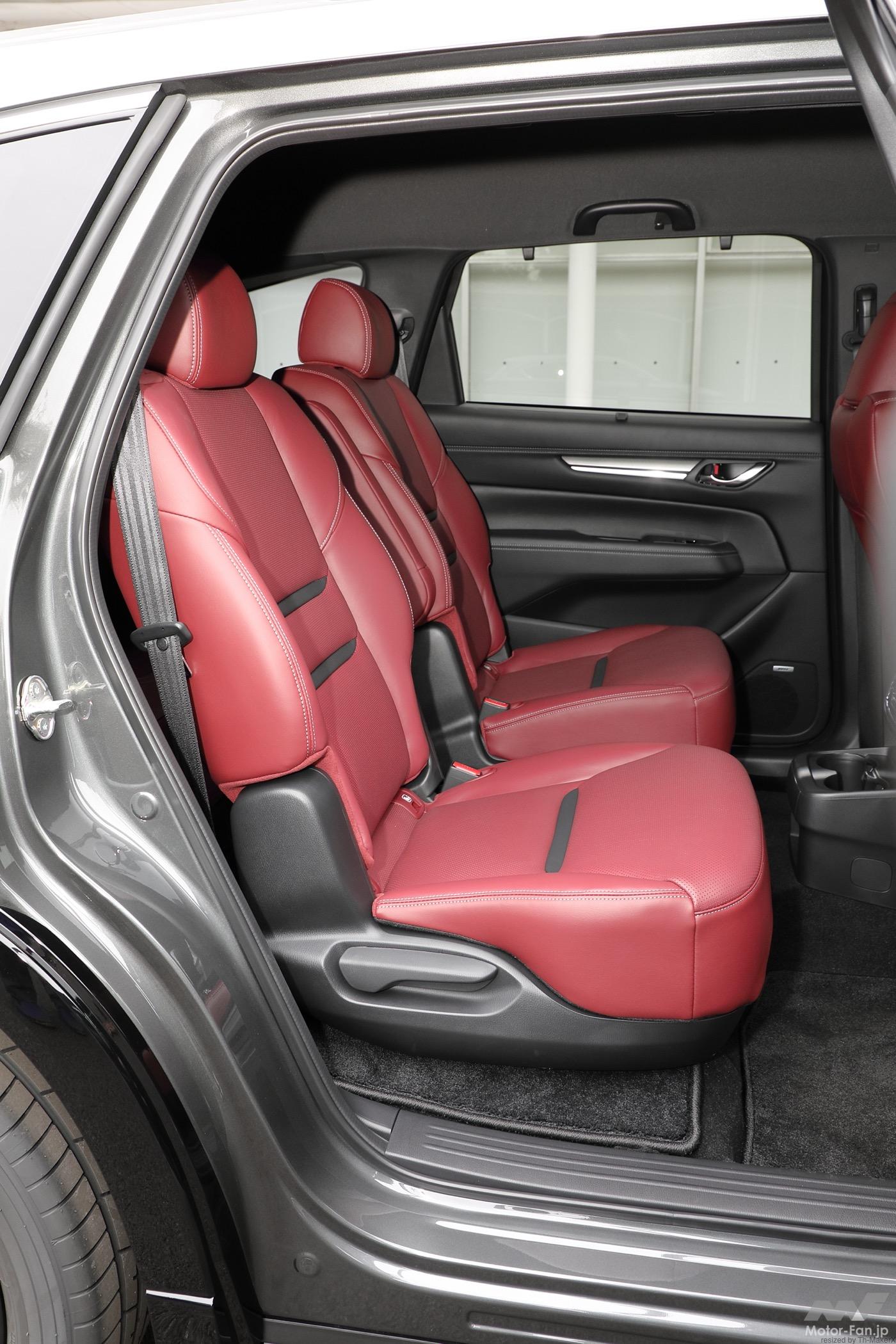 アピアランスの進化で注目すべきはリヤまわりだ。大きく変わったのはリヤバンパーで、そのほかテールレンズやシグネチャーなども改良が施されている。バンパーは横から見たときにはスパッと断ち切って見えるようにしつつ、後ろからはワイドで重心の低いスタンスの効いたフォルムに見せている。3列シート車であるCX-8のボリューム感を見事に表現している。