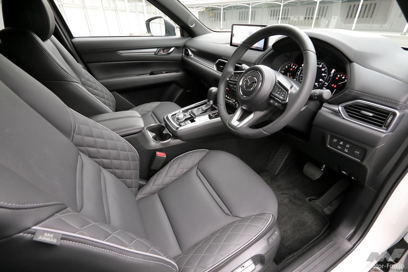 インテリアでの進化ポイントは、フロントシートである。全グレードで改良を受けているが、とくに本革シートについては座面のクッションばねを板状としたほか、座面形状自体を見直すことで、”骨盤を立たせる”ようにしている。マツダは「歩いているときの自然な姿勢を再現している」と主張しているが、実際に座ってみても、違和感なくシートと一体になったかのような感触が味わえることが確認できた。