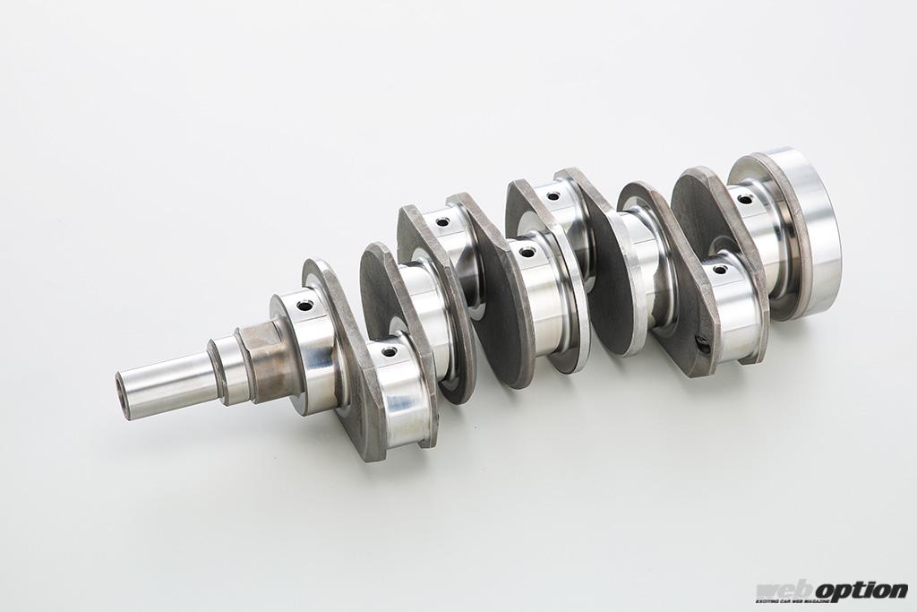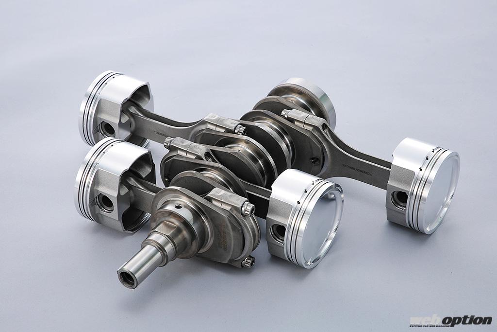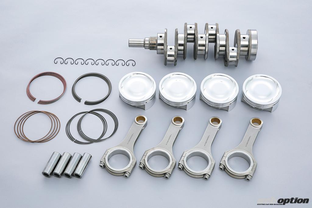 このキットのコア技術は、新開発のクランクシャフトだ。鍛造ビレットの削り出しとしつつ、カウンターウエイトにはフルカウンター式を採用。なお、フルカウンター形状は高回転域での振動を減らせるという大きなメリットがある反面、デメリットも存在する。重量増加に伴うレスポンスの悪化や、メタルの負担増加だ。