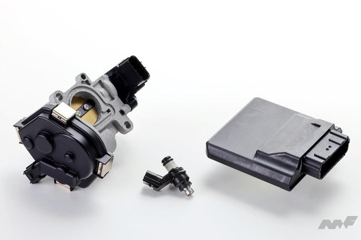 バイクパーツ 日立Astemoがミニバイク向けの吸気FIシステム『MINI ETB』を初公開!バイオエタノールにも適用【EICMA2023】【写真・1枚目】 写真左)MINI ETB (Electronic Throttle Body Body/小型電子制御スロットルボディ) 写真中)フレックスフューエル対応フューエルインジェクター 写真右)MINI ETB ECU(Engine Control Unit Unit/小型エンジンコントロールユニット) この画像の記事を読む