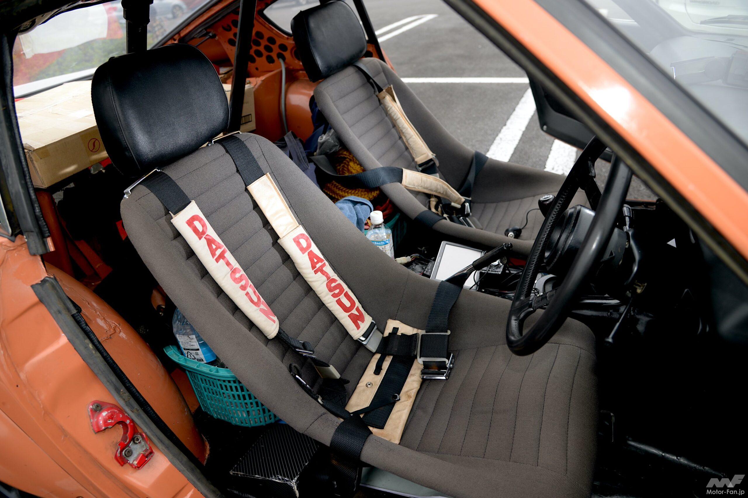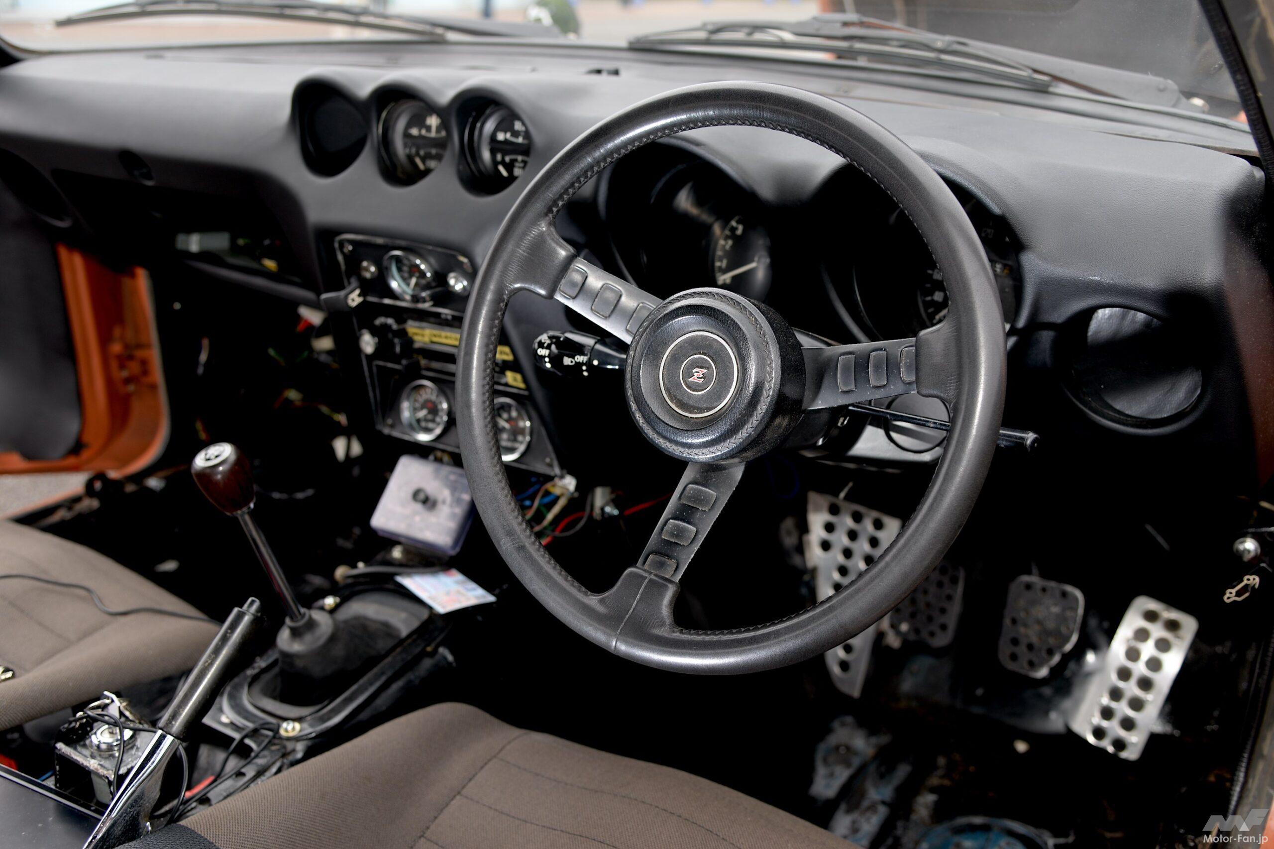 入手時にシビック用となっていたダッシュボードはZ432-Rのものへ入れ替えたのは当然としても、困るのは計器類やステアリングホイール、シフトレバーなどだろう。ところが現車を見れば、ほぼ完璧に近い仕様へ再現されている。参戦当時のステアリングやシフトノブがどうだったのかまでは不明ながら、現在はZ432初期型に採用されたスポークに穴が開いていないステアリングや市販Z432のシフトノブが装着されている。