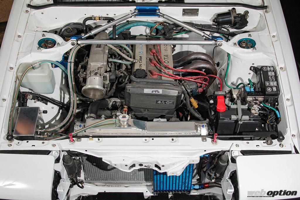 レストア時に補修&塗り直されたエンジンルームは、追加された冷却パーツや配線処理によってスッキリかつ美しく製作。エンジンはノーマルのAE92エンジンだが、近いうちにファインチューンされた5バルブ仕様に載せ換える予定だ。