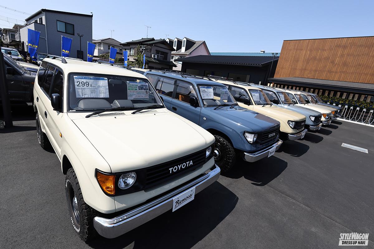 『Renoca』店としては2店目となる当店、圧倒的な『Renoca』仕様の在庫量を誇る! そもそも『Renoca』は、ただリフレッシュするだけでなく“クラシカル”“カワイイ”要素をプラスした唯一無二の個性を持つ。1台1台架装をするわけで、ココまでの台数を並べるのは簡単ではなく、ランクル、ハイエースを筆頭に様々なタイプの車両が並ぶのはスゴイのひと言。クルマの仕上がり、色味等々、実車をジックリ検分できるのは嬉しい限りだ。