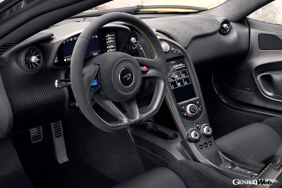 P1の基本構造体となっているのは、もちろんカーボン製のモノコックで、P1の時代は「モノケージ」と呼ばれた。タブやルーフを始め、エンジンエアインテーク、バッテリー及び電源を収めるハウジング、そしてマクラーレンが20世紀に生み出したスーパースポーツの最高傑作とも評される「F1ロードカー」との血筋を感じさせるルーフ・シュノーケルまでをも含めた、このモノコックの重量はわずかに90kg。もちろん当時のロードカーとしては史上最軽量レベルの数字である。