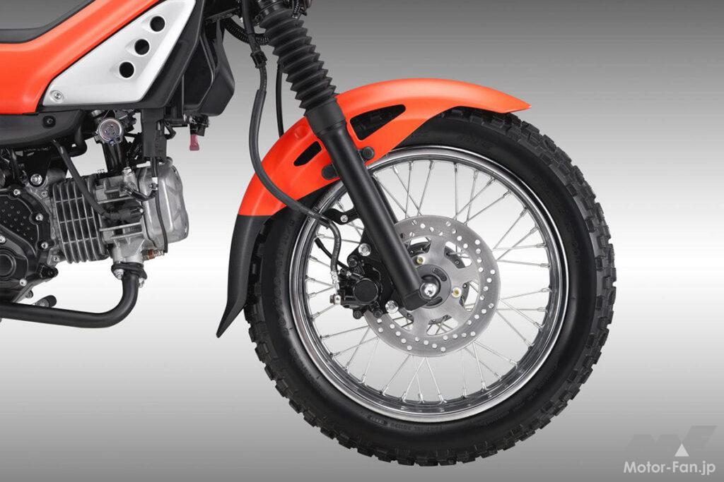 前後のスポークホイールは16インチに設定し(CT125・ハンターカブは前後17インチ)、悪路走行も想定したブロックパターンタイヤを組み合わせ。ブレーキはフロントのみ油圧式ディスクブレーキを採用し、リアは低コストなドラムブレーキを導入。なお2023年12月現在、国内での発売は未定。