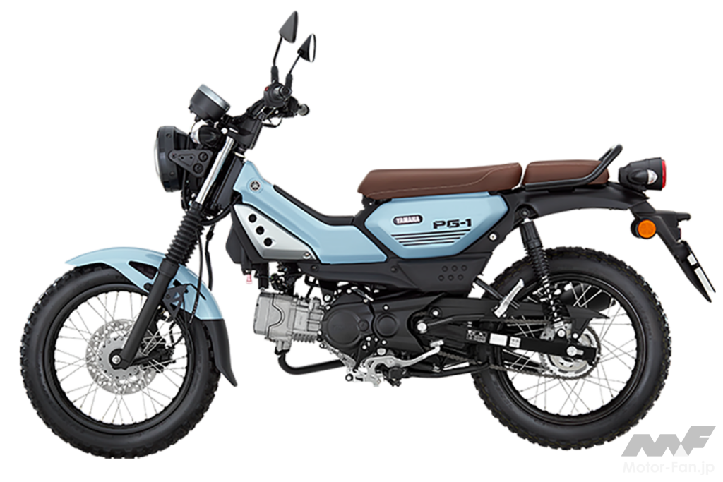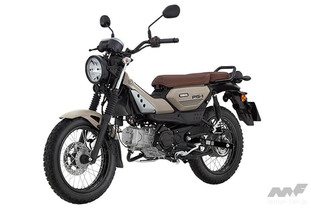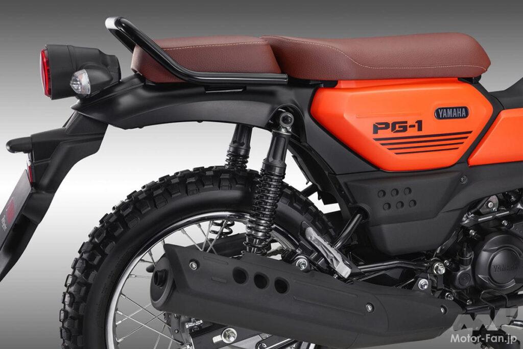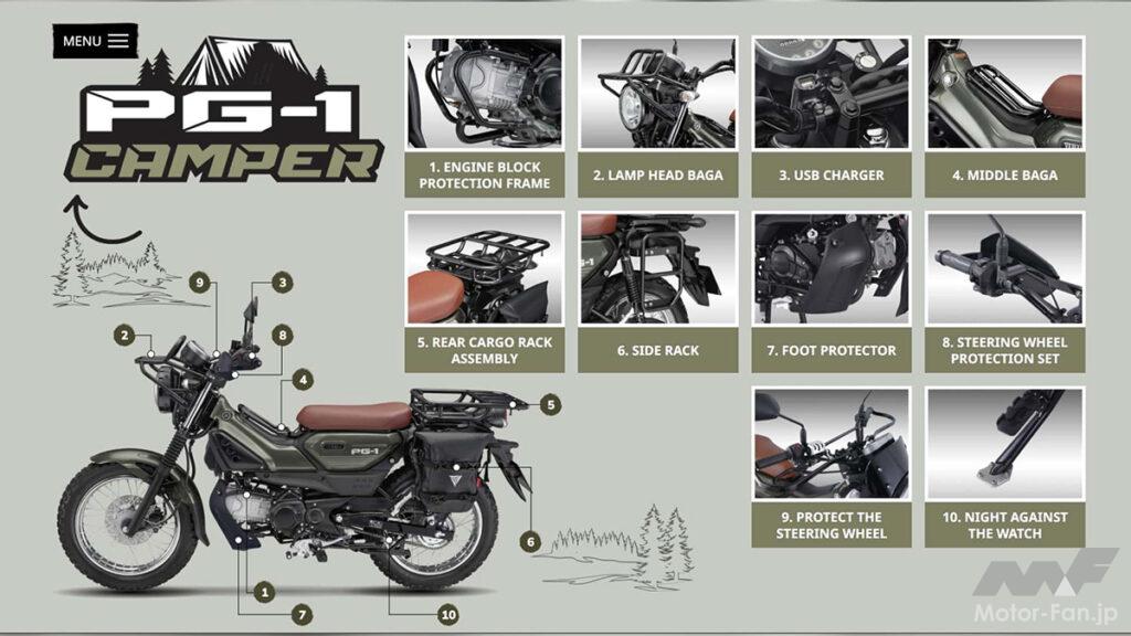 大径の丸型ヘッドライト、防塵用のゴム製ブーツを装備した正立型フロントフォーク、快適なタンデム(二人乗り)性を実現するセパレート型シートを採用したPG-1は、国内でも人気のモデル「ホンダCT125・ハンターカブ」のライバルとも呼ぶべき、アウトドア志向の外観と足周りが特徴だ。