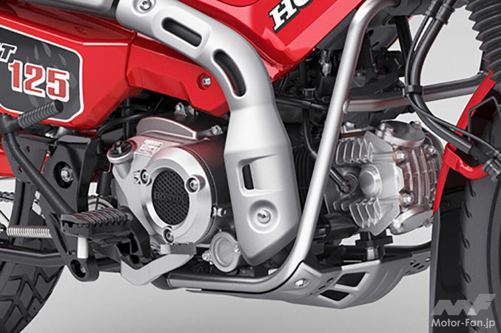 両車ともエンジンの種類は同じ。また腰上(シリンダーヘッドとシリンダー)をフロントタイヤ方向にレイアウトした“横型エンジン”に設計。PG-1の排気量は113.7ccだが、123ccのCT125・ハンターカブに迫る最高出力9馬力を発揮する。