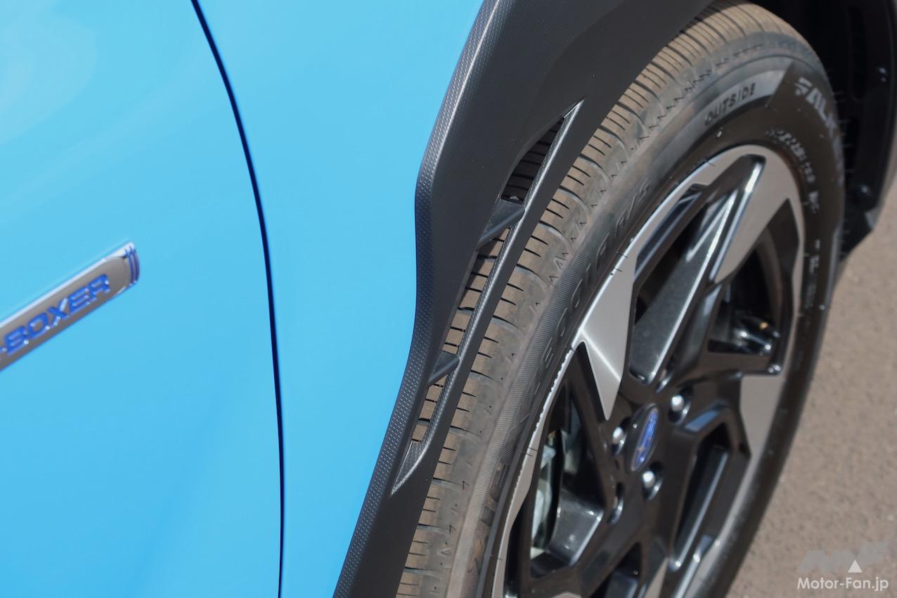 ボディ形状や外装パーツを最適化することによって車体まわりの空気の流れをコントロールする技術は、BRZやWRX S4(ともに2021年発売)で培っており、これをクロストレックにも適用。前後バンパーに設けられたエアアウトレットは、ホイールハウスやリヤバンパー内に溜まる空気を積極的に排出することにより、タイヤの接地性が向上し、ステアフィールの向上や高速走行時の直進安定性向上に効果を発揮する。