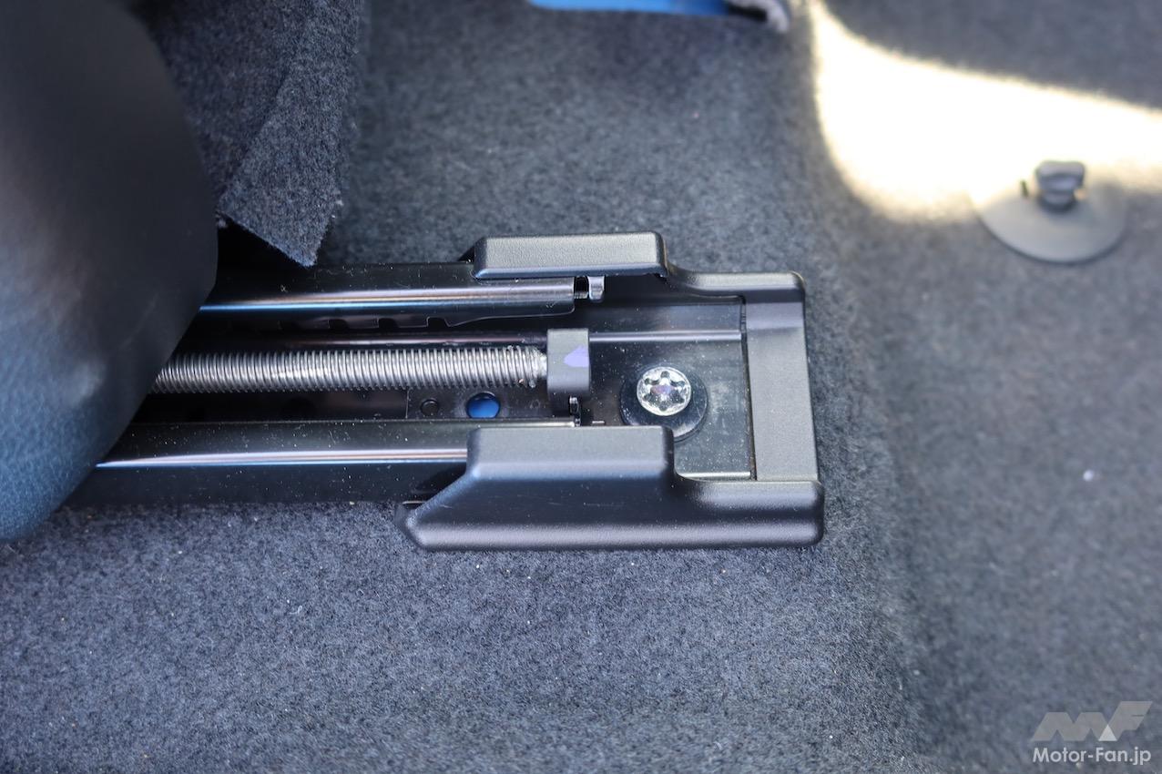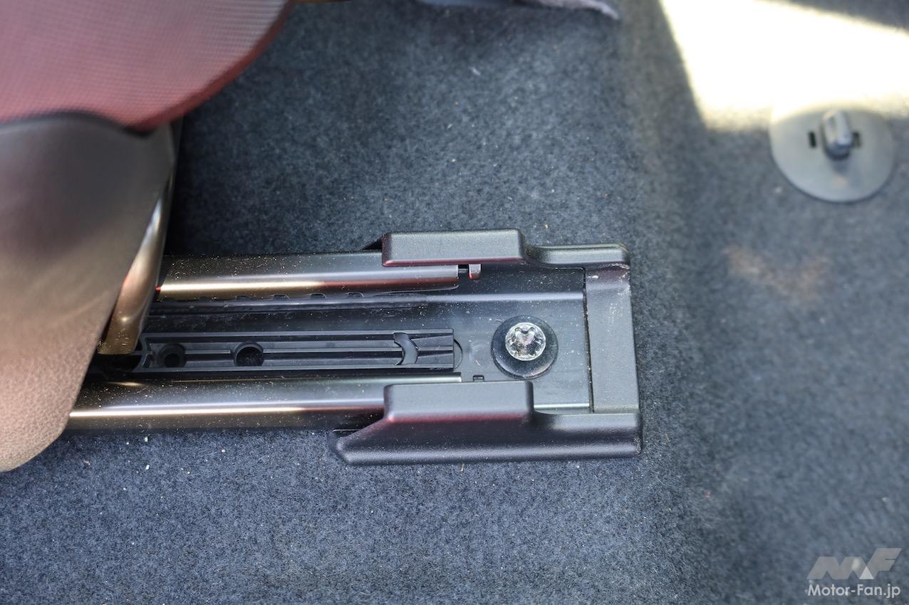 頭が振られると、不快に感じるだけでなく、頭を安定させようと無意識に首や身体に力が入るため、疲労の原因になる。新型クロストレックの新構造シートは、仙骨を押さえて骨盤を支える構造とした。仙骨を押さえると、頭や身体の揺れが自然と抑えられることが、研究の結果わかったからだ。新構造シートの開発に合わせ、シートと車体の固定構造も変更した。従来はブラケットを介して車体に固定していたが、新型クロストレックではシートレールを直接クロスメンバーに固定している。取り付け部の剛性を高めるためだ。固定に用いるウェルドナット(溶接により接合するナット)は形状を見直し、ボルト締結力を面でしっかり受ける形状に変更。剛性アップに寄与している。