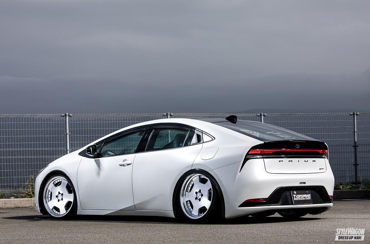 新型を速攻カスタムしたのは、全国区の知名度を誇るカスタムショップ、Tセレクションだ。真っ先に挑戦した足まわりカスタムによる、激落ち車高、リムかぶりの大口径といった様は、プリウス純正バンパーがシンプル、かつ小ぶりであることも功を奏し、VIPセダンで流行った往年の“仙台スタイル”を彷彿とさせる。