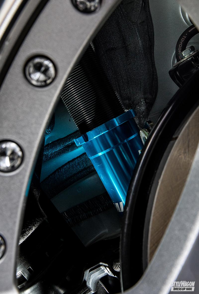 そんなプリウスカスタムは、市販パーツがほぼゼロの状態で始まった。すべてが手探りだったこともあり、軸となる車高調は懇意にしている「イデアル」協力の元、プロトを装着。ホイールハウスインナー等にも手を加えつつ、下げうる限界まで下げている。が、ここまでの激落ちとなると周辺パーツの対策は当然必要。そこで今回は、同じ東北圏内にあり、足まわりへのこだわりが人一倍強い「ジェーライン」にも協力を依頼。限界車高により起こるダンパーのストローク不足やアームロックといった弊害を、同社の知見を活かした試作パーツで解消と、このクルマが開発車となりセッティングを進めた。
