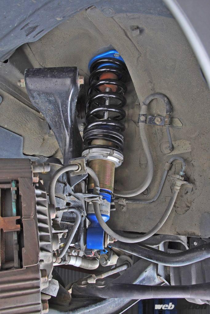 足回りはビルシュタインベースのレヴォルフェオリジナル車高調(F12kg/mm R8kg/mm)を軸にセットアップ。また、ガタが出やすくサスチューンの足かせとなりやすいハイキャスは、東名パワードのロッドを使用してキャンセルしている。