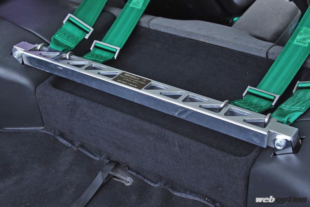 フロント同様、リヤストラット間にも超極太のボーダー製タワーバー(廃盤モデル)をセット。ハッチバックのZ32はリヤの剛性が低いため、この手のパーツは必須と言える。