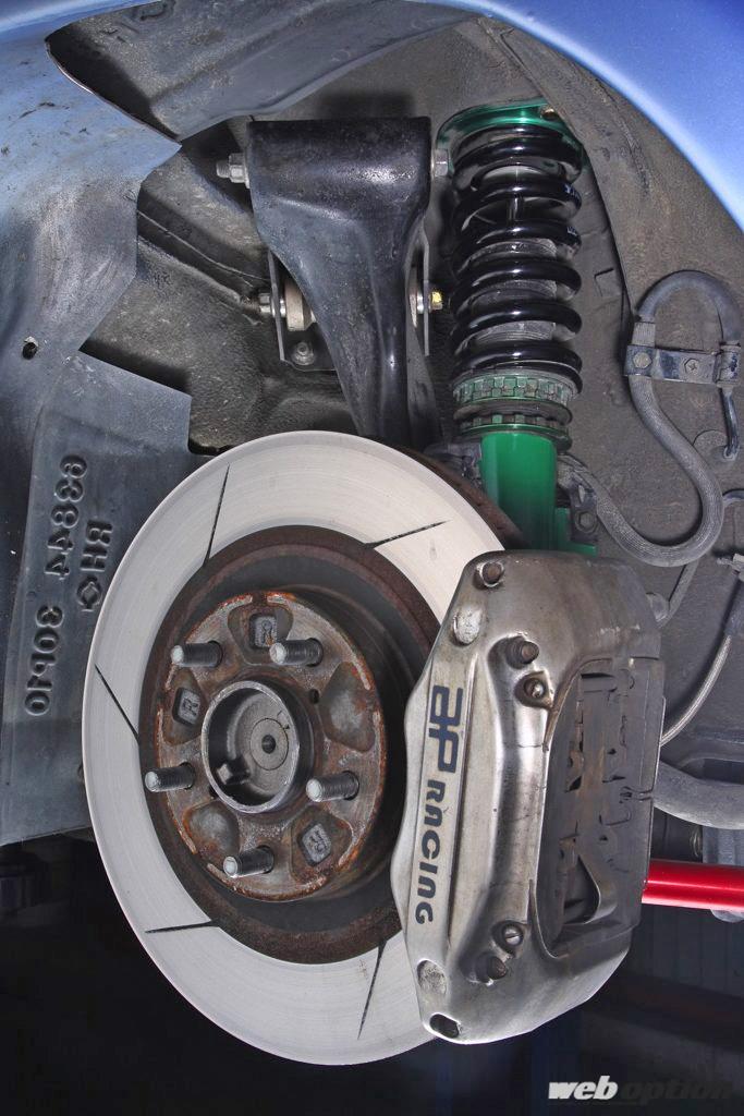 フロントのブレーキキャリパー&ローターはAPレーシング製のキットで容量アップが図られ、リヤもBNR32純正ローターへと変更されている。車高調はテインのフレックス(F10kg/mm R8lg/mm)だ。
