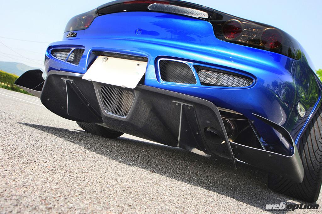 リヤのデザインも秀逸だ。リヤバンパー(8万3490円)をあえて純正同サイズとして大型カーボンディフューザー(21万2520円)をセットし、リヤビューの迫力を最優先した設計となる。アブフラッグでは汎用設計のディフューザーキットをラインナップしているが、これはFD3S専用設計となる。