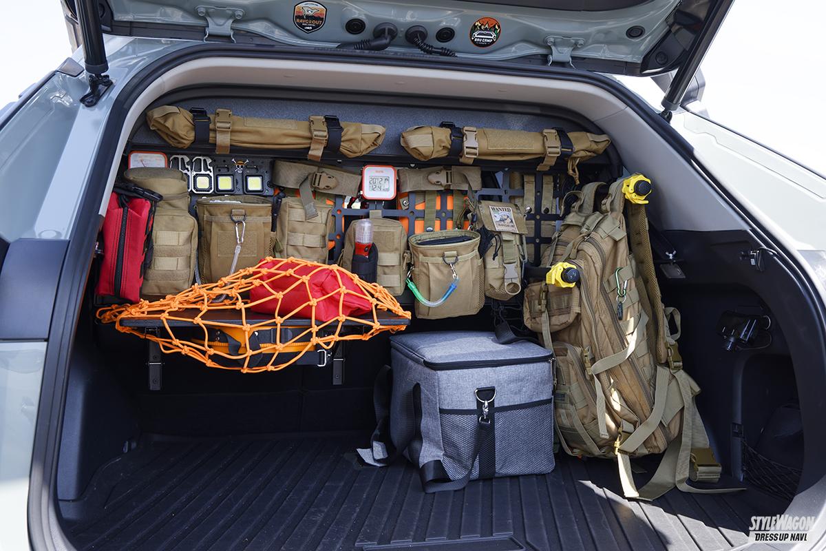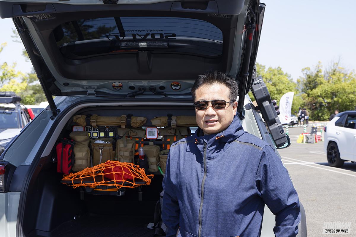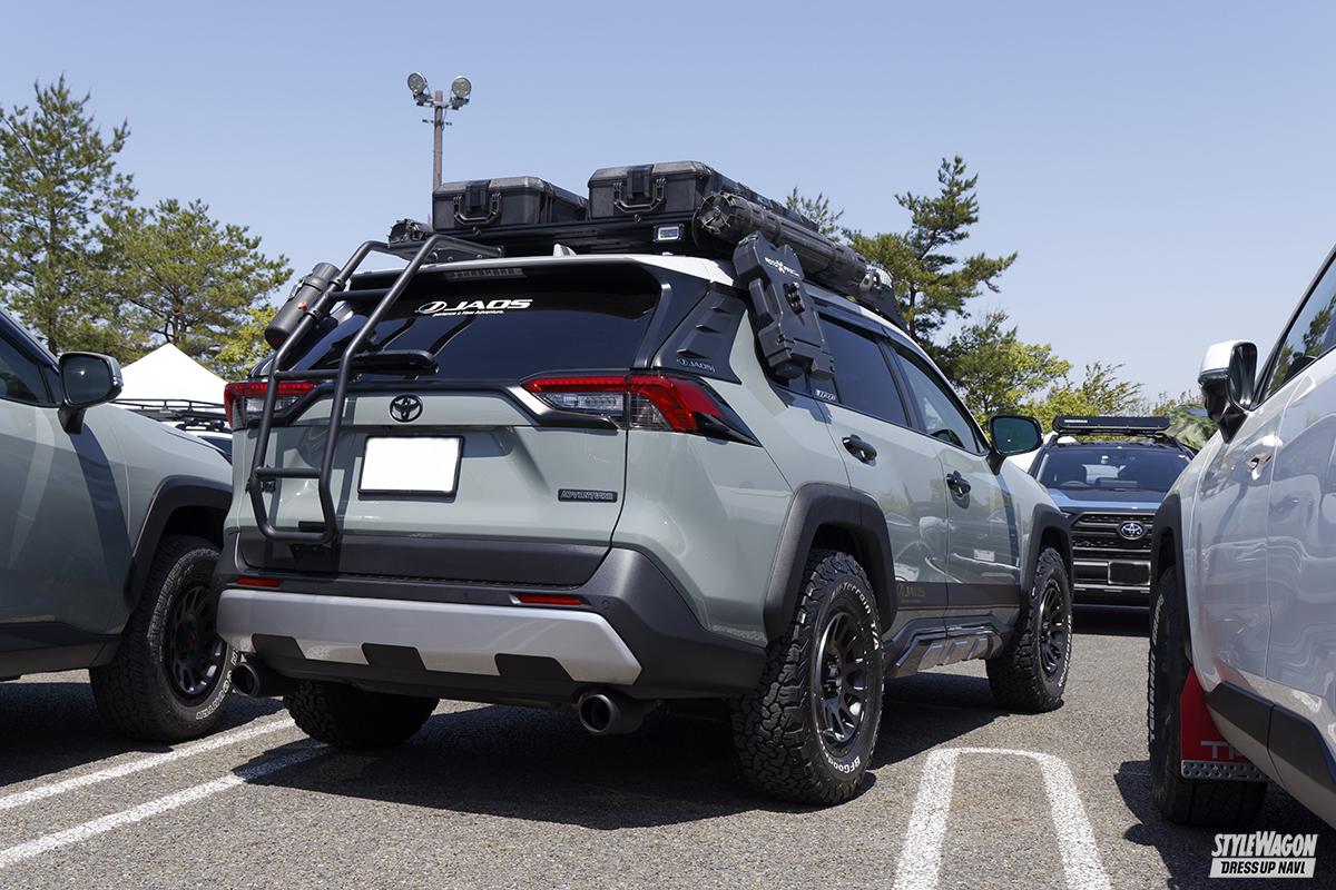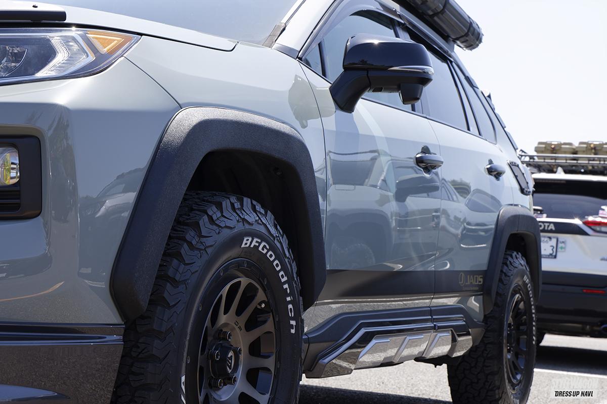 エクステリアはアウトドアに映えるイマドキなオーバーランダースタイルながら、中身は災害時にリュックひとつですぐに脱出できるタフな装備がリアに満載されたRAV4。車体はタナベのUP210スプリングで1インチのアップ、さらにタイヤなどを含めると70㎜の車高アップを果たしているのだ。JAOSのノーズ/サイド/ピラー・プロテクターを備え、ホイールはRAV4でも大人気のデルタフォース17インチ。純正風にプラスオンされた15㎜ワイドの樹脂製自作フェンダーはラプターライナーの上にショット風のツブツブを再現するなど芸が細かい。さらにKSPのワイドトレッドスペーサー(30㎜)によりワイド化したフェンダーとのツラもピッタリ。ルーフ左右の丸い筒は80㎜φの砲弾ケースを改良した収納庫。キャンプ道具や傘入れとして使っているとか。とにかく見どころ満載な1台だ。