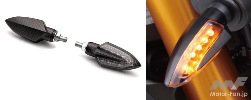 9発のLEDを採用したウインカー(2個セット)。ノーマルもシャープなウインカーだが、こちらはよりスタイリッシュなデザインを採用。精悍なブラックとカスタム感溢れるカーボンルック(写真)の2種をラインナップ。