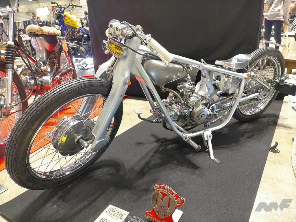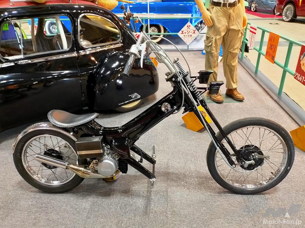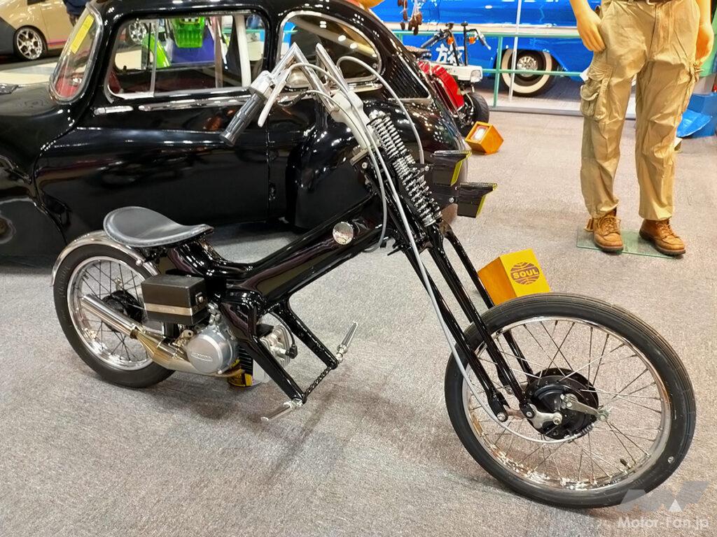 カスタムショップ「SOUL ART&ROD」ブースに展示されたミニチョッパー。ワンオフのフレームや、超ロングなワンオフのスプリンガーフォークを導入するなど、ミニバイクながら見事なチョッパーフォルムを完成させている。