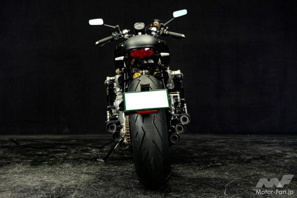 マシンのリアビューをワイルドなイメージに仕上げるRemotionのワンオフ6in6マフラーは、右3本出し・左3本出しのチタン製。なお製作金額は、ベース車両+400万円が目安。