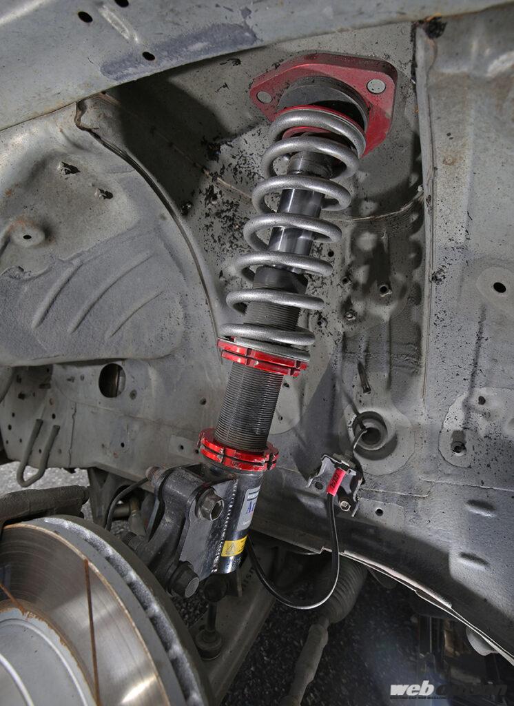 足回りは某D1選手が監修したミラルダオリジナル車高調を選択。サスペンションプラスの特注スプリングが組み込まれ、レートはフロント5.5kg/mm、リヤ4kg/mm。積極的に足を動かすセッティングで、ドリフトしやすく街乗りも快適。減衰力は20段調整式だ。